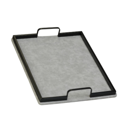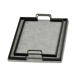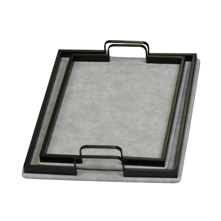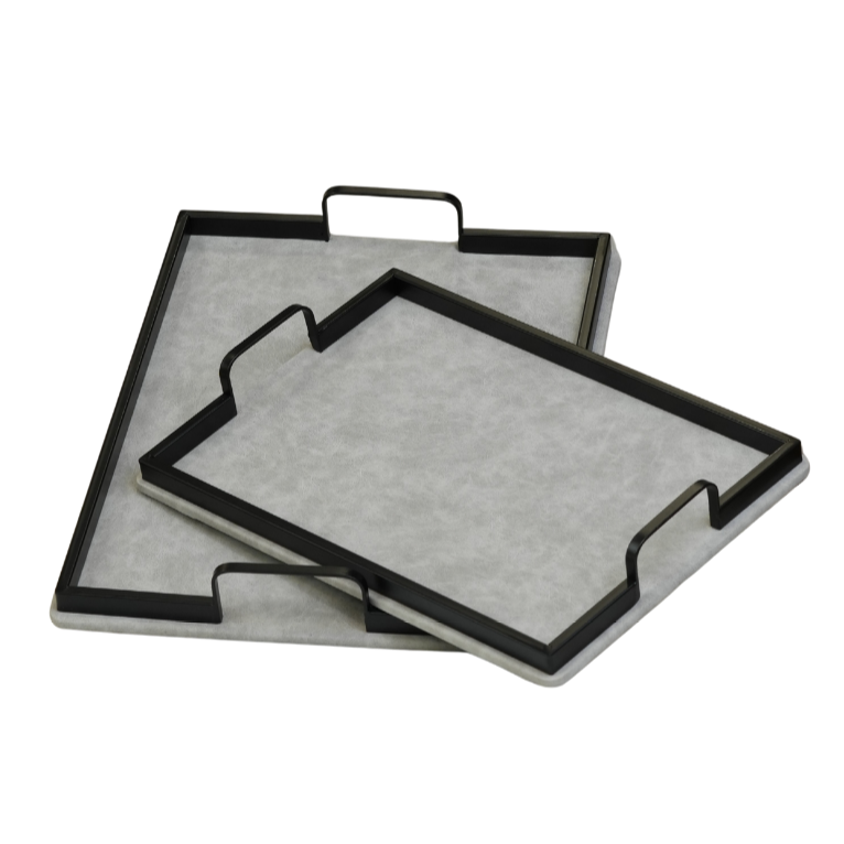 طقم ضيافة أنيق يتكون من صينيتين مستطيلتين بمقاسات متداخلة. تتميز الصواني بقاعدة مكسوة بـ قماش المخمل الناعم