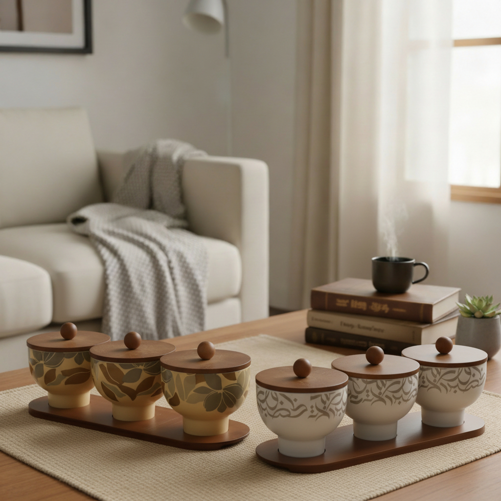 هذا المنتج عبارة عن طقم ضيافة أنيق مكون من أوعية مصنوعة من البورسلان أو السيراميك الفاخر، وتأتي مع أغطية خشبية محكمة ومزودة بمقابض دائرية سهلة الإمساك. يتم ترتيب الأوعية على قاعدة أو صينية خشبية تضفي لمسة طبيعية وعصرية على طاولة التقديم. يُستخدم هذا الطقم بشكل مثالي لتقديم التمر، المكسرات، الحلويات، أو حتى كعلب للأطياب والبهارات في المناسبات والعزائم الراقية.
