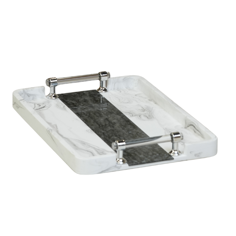 قطعة ديكور فاخرة مصنوعة من الرخام الطبيعي بتصميم "عرق الخشب" العتيق، تتميز بمزيج لوني يجمع بين الأناقة الكلاسيكية واللمسة العصرية. الصينية مزودة بمقابض جانبية تمنحها طابعاً جمالياً وتسهل استخدامها كقطعة للتقديم أو كمنصة لعرض العطور والمجوهرات في غرف النوم والاستقبال