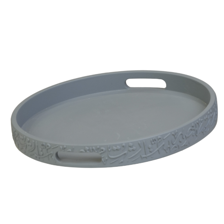 صينية دائرية فاخرة تتميز بنقوش بارزة لخطوط عربية على جوانبها، ومزودة بمقابض مدمجة لسهولة الحمل