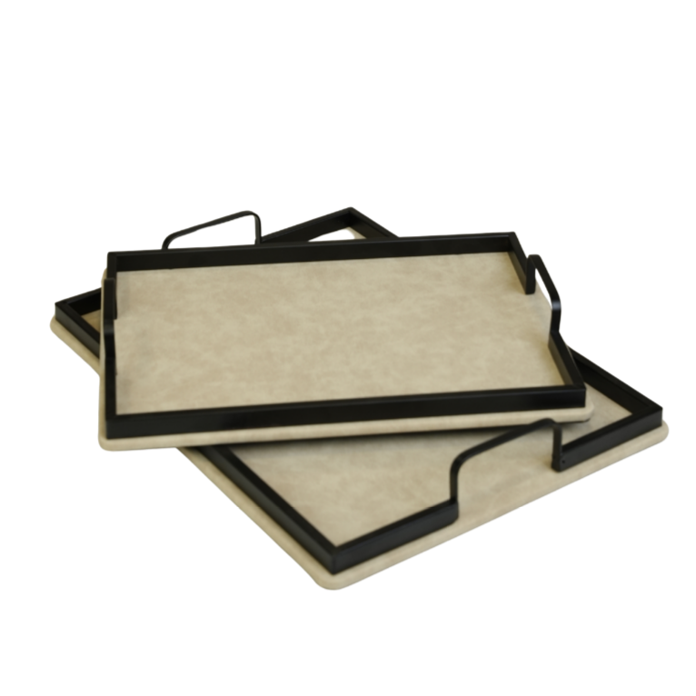 طقم ضيافة أنيق يتكون من صينيتين مستطيلتين بمقاسات متداخلة. تتميز الصواني بقاعدة مكسوة بـ قماش المخمل الناعم