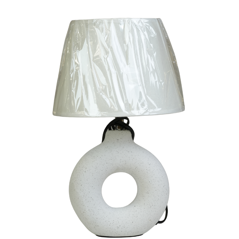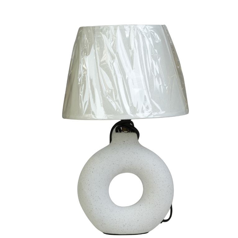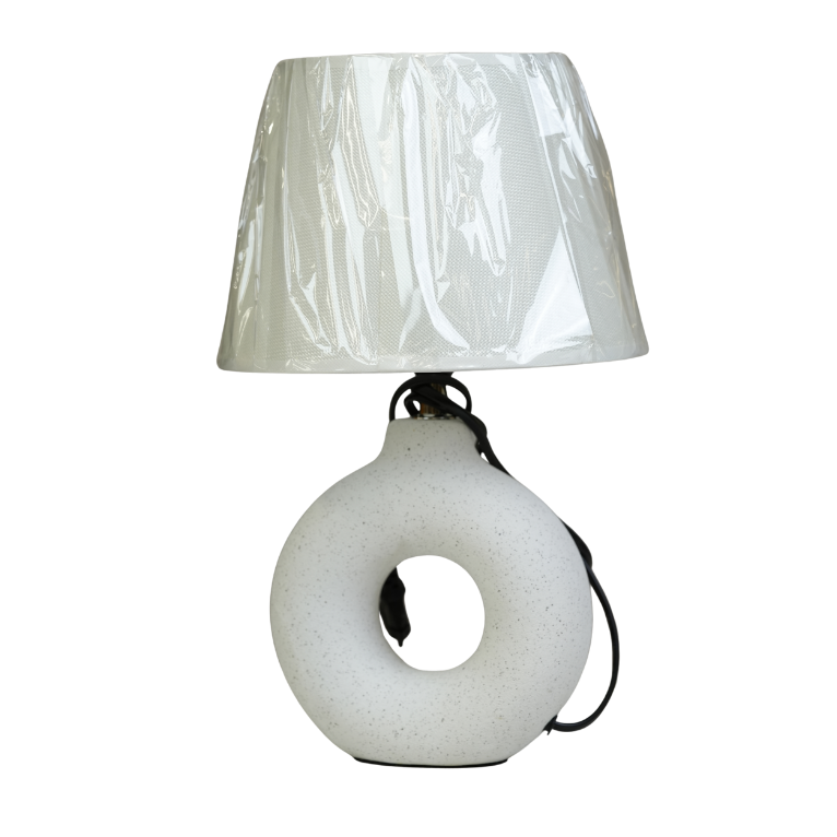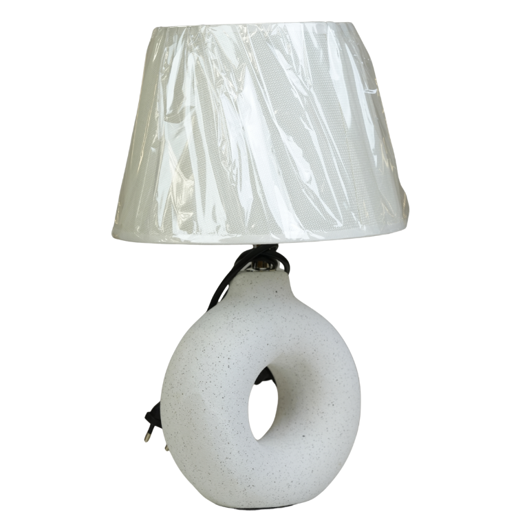 أضف لمسة من الأناقة العصرية إلى منزلك مع هذا المصباح المصنوع من السيراميك الفاخر بتصميم عضوي على شكل حلقة (دونات). يتميز بقاعدة ذات ملمس حجري ناعم ولون أبيض محايد يتناسب مع مختلف الديكورات، سواء في غرفة النوم أو المعيشة. يأتي مع غطاء قماشي كلاسيكي يوزع الإضاءة بشكل دافئ ومريح.