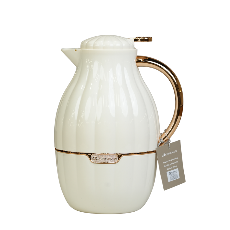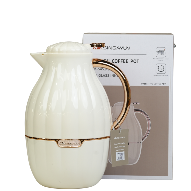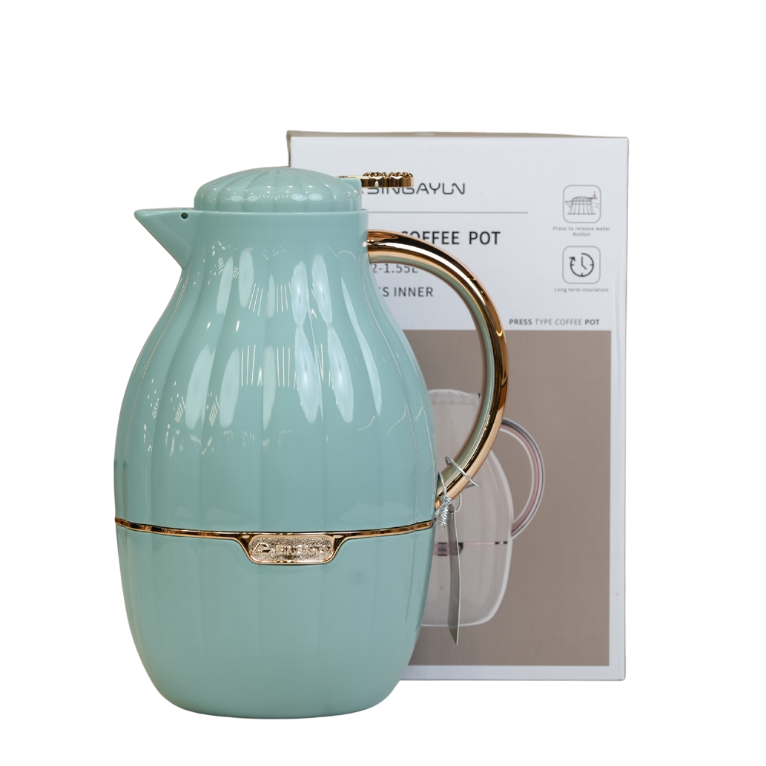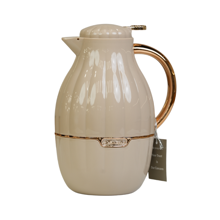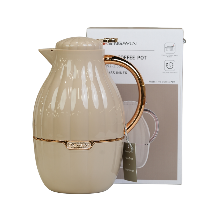 دلة قهوة بتصميم عصري وأنيق، تتميز بهيكل خارجي محزز ومقبض مريح مطلي بلون ذهبي أو نحاسي. تحتوي على بطانة زجاجية داخلية عالية الجودة لحفظ الحرارة لمدة تصل إلى 12 ساعة. متوفرة بعدة ألوان جذابة مثل البيج، الأبيض، الأخضر، لتناسب مختلف الأذواق والمناسبات.