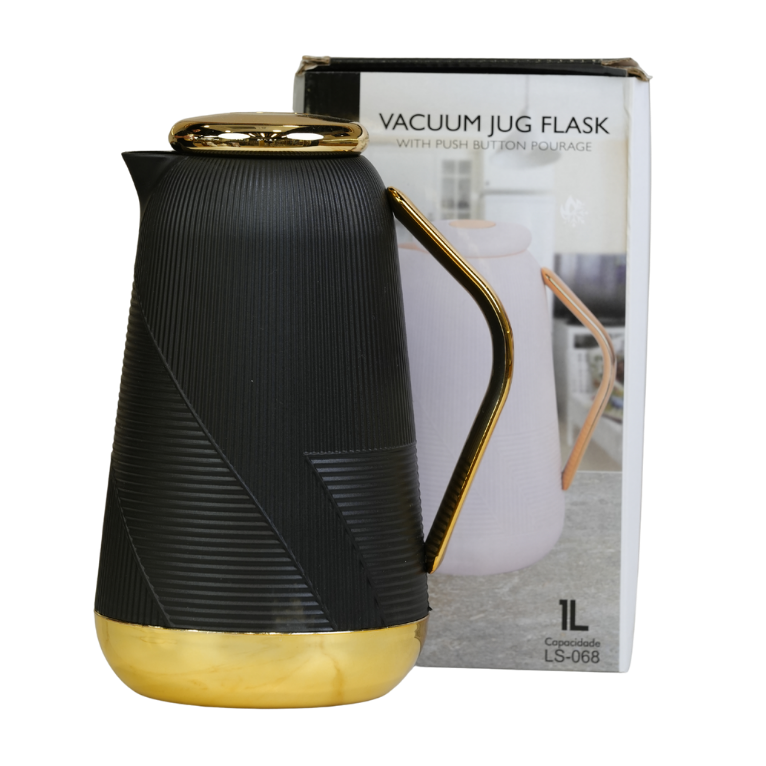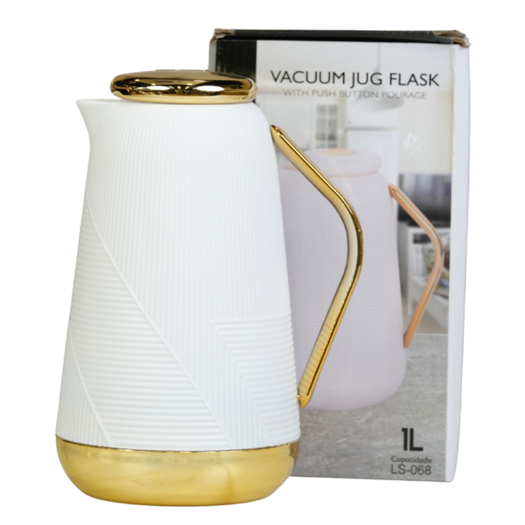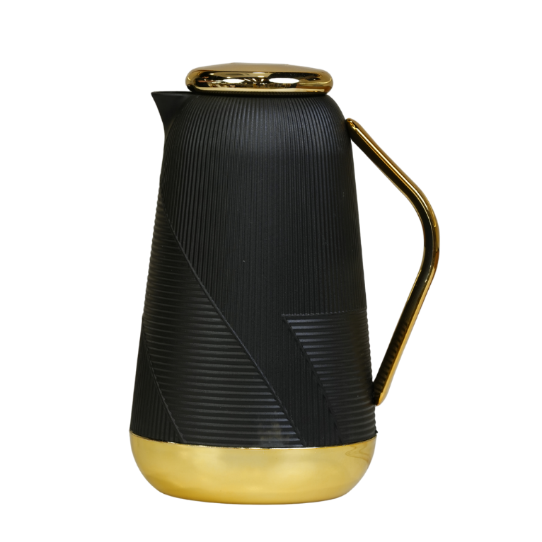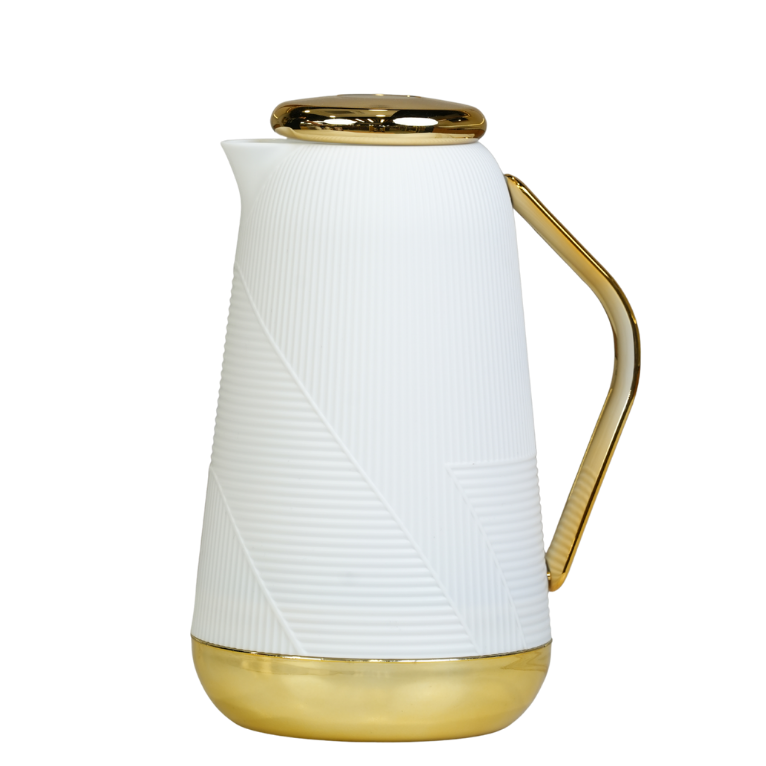 دلة عصرية وأنيقة مصممة بجدار عازل للحرارة للحفاظ على المشروبات (القهوة والشاي) ساخنة أو باردة لساعات طويلة. تتميز بتصميم أبيض كلاسيكي او اسود مع لمسات ذهبية فاخرة على القاعدة والمقبض والغطاء، ومزودة بنظام ضغط لسهولة الصب ومنع التسرب.