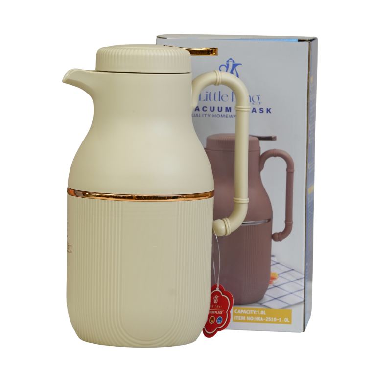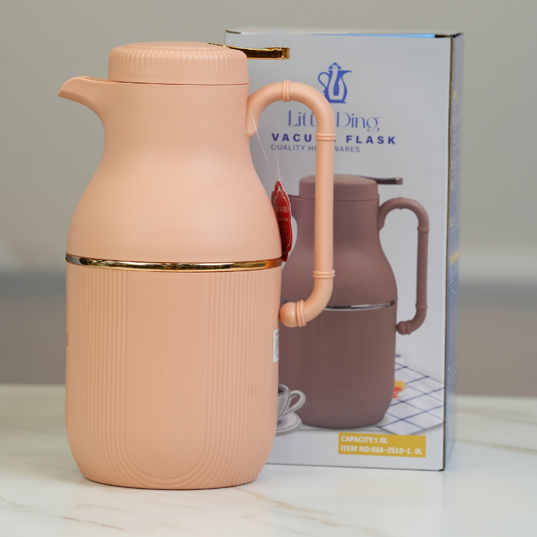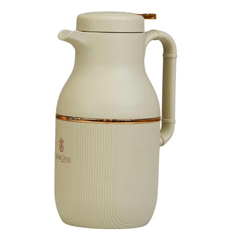 دلة عازلة للحرارة بتصميم أنيق يتميز بهيكل خارجي بخطوط طولية بارزة ولمسات ذهبية فاخرة. مثالي لتقديم القهوة والشاي، حيث يحافظ على درجة حرارة المشروبات بفعالية بفضل الزجاج الداخلي عالي الجودة.