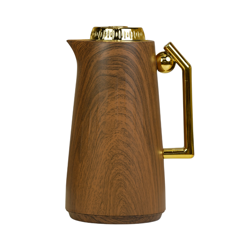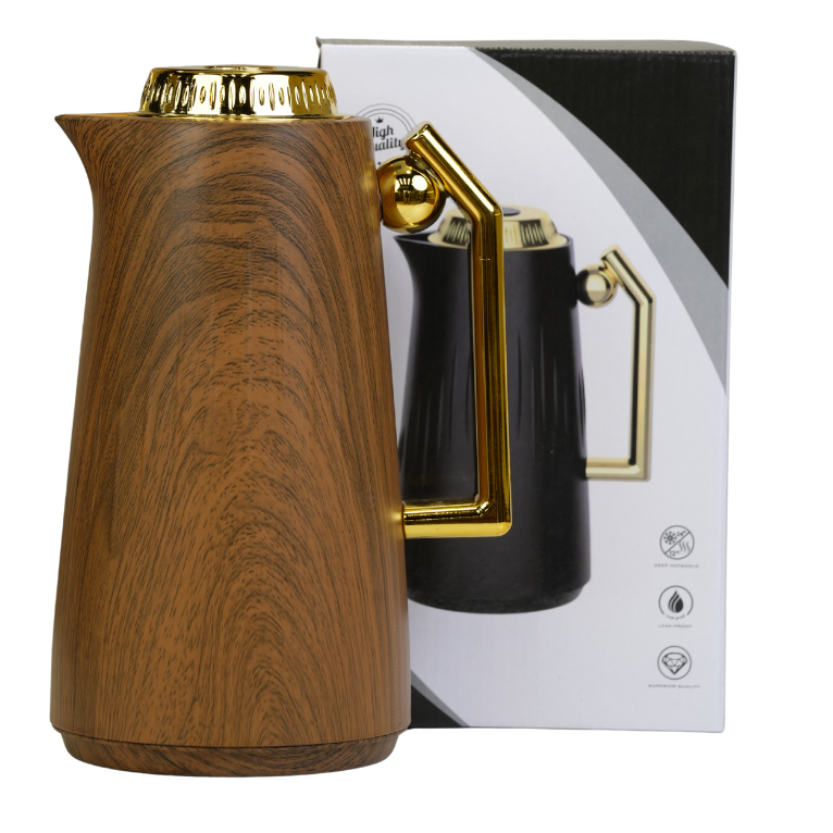 أضف لمسة من الفخامة العصرية إلى ضيافتك مع هذا الترمس الحراري الأنيق. يتميز بتصميم خارجي يحاكي ملمس الخشب الطبيعي مع تفاصيل ذهبية براقة على المقبض والغطاء، مما يجعله قطعة مثالية لتقديم الشاي والقهوة في المناسبات. صُمم بهيكل عازل عالي الجودة يحفظ حرارة المشروبات لساعات طويلة، مع فوهة صب دقيقة تضمن تقديماً سهلاً ونظيفاً.