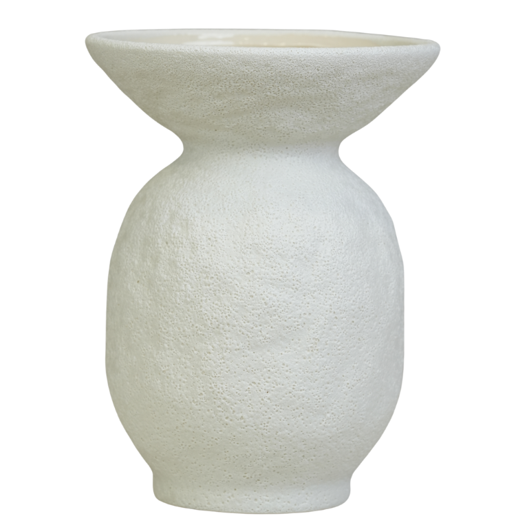 تحفة فنية تتميز بتصميمها الانسيابي الذي يجمع بين القاعدة المستديرة والعنق الواسع بأسلوب عصري فريد. تبرز جمالية هذه القطعة في لونها الأبيض الهادئ وملمسها المحبب البارز، مما يمنحها طابعاً "مينيماليست" يحاكي المنحوتات الحجرية الطبيعية. هي قطعة مثالية لتزيين أرفف الكتب، طاولات القهوة، أو المداخل، حيث تضفي لمسة من الفخامة الهادئة والتميز الفني على ديكور منزلك.