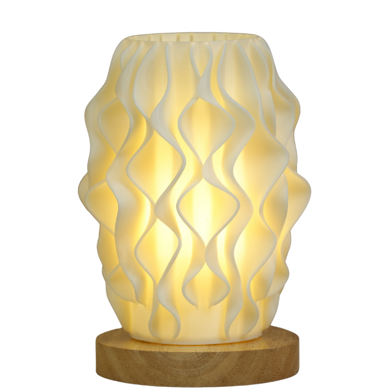 أضف لمسة من الفخامة العصرية إلى منزلك مع هذا المصباح الفريد المصنوع بتقنية الطباعة ثلاثية الأبعاد. يتميز بتصميمه الانسيابي المستوحى من الطبيعة، ومصنوع من مواد مستدامة وصديقة للبيئة (PLA) مستخلصة من نشا الذرة. قاعدته الخشبية الطبيعية تضفي دفئاً على المكان، مما يجعله قطعة ديكور مثالية لغرف النوم أو المكاتب لتوفير إضاءة ناعمة ومريحة