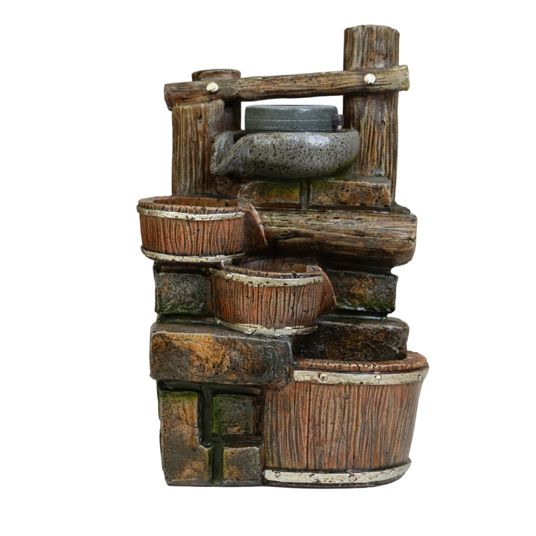 أضف لمسة من الطبيعة والهدوء إلى مساحتك الخاصة مع هذه النافورة المزخرفة بتصميم ريفي فريد. تتميز بتدفق المياه الانسيابي عبر طبقات تحاكي البراميل الخشبية وجدران الحجر، مما يخلق صوتاً مهدئاً يساعد على الاسترخاء. النافورة مصنوعة من الراتنج (الراتينج) المتين وتأتي مزودة بإضاءة LED جذابة، مما يجعلها قطعة ديكور مثالية للمنازل، المكاتب، أو الزوايا الخارجية.