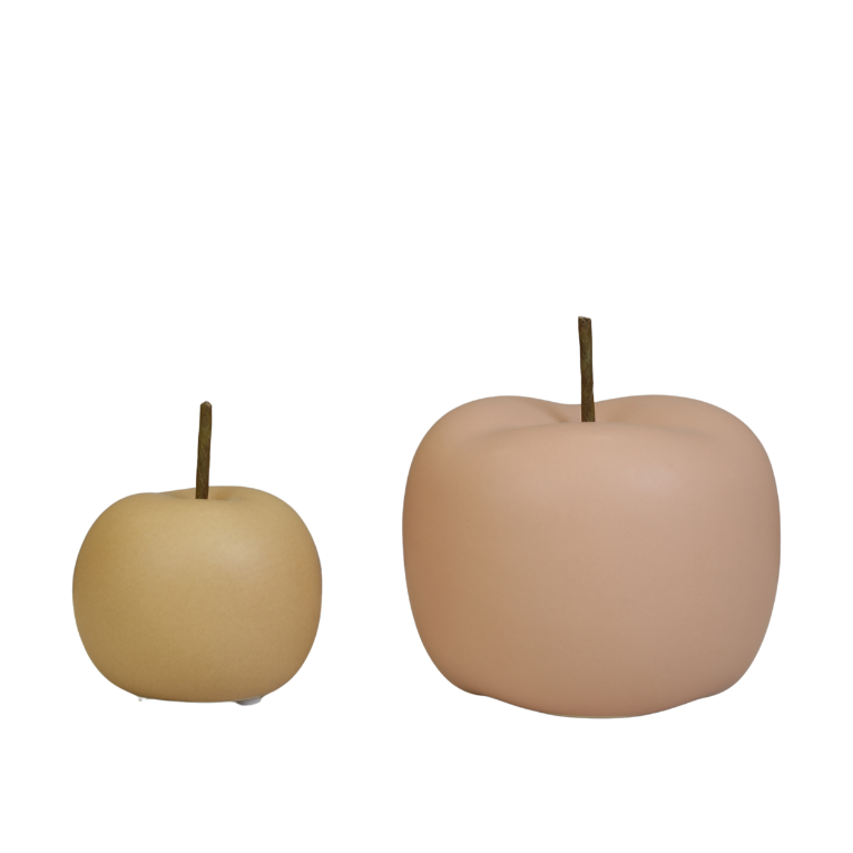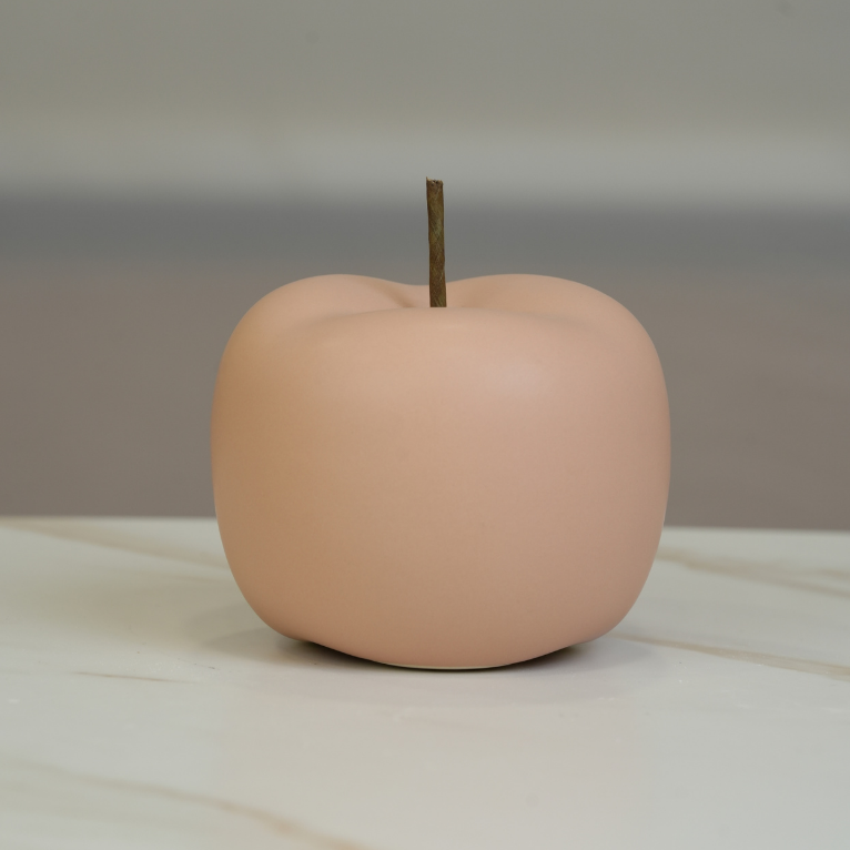 قطعة ديكور عصرية وفخمة مصممة على شكل ثمرة تفاح بأسلوب بسيط (Minimalist) وملمس مطفي ناعم (Matte Finish). تتميز بلونها الوردي الهادئ (Blush Pink) وتفاصيل الساق الخشبية الطبيعية، مما يمنحها لمسة فنية فريدة تناسب غرف المعيشة، المكاتب، أو كقطعة مركزية على طاولة الطعام.