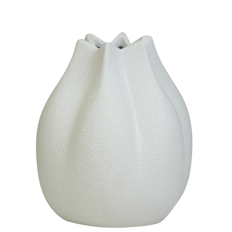 أضف لمسة من الأناقة العصرية إلى منزلك مع هذه المزهرية الخزفية المميزة. تتميز بتصميم عضوي مستوحى من بتلات الزهور المنحوتة وملمس حبيبي يمنحها طابعاً طبيعياً وفخماً. مثالية لتزيين طاولات القهوة أو الأرفف، وتتناسب تماماً مع الديكورات المودرن والساحلية.