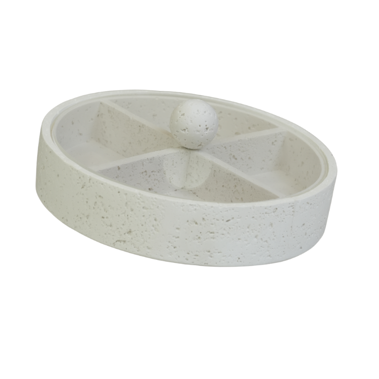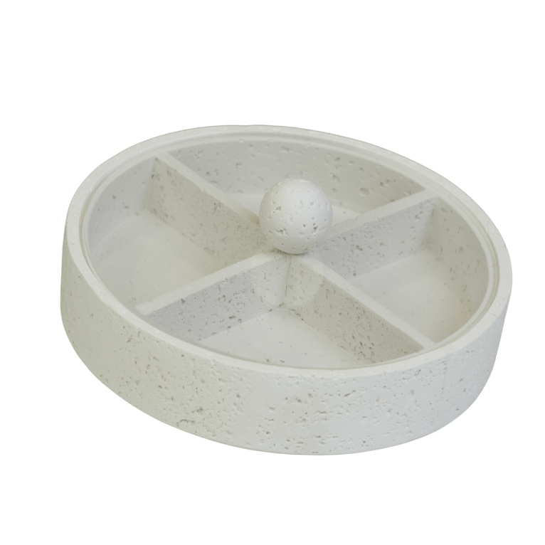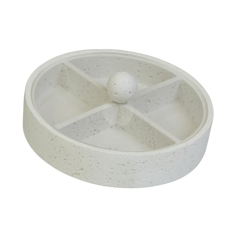 مضيفة حلويات عصرية بتصميم عملي مقسم لأربعة أقسام، تتيح لك تقديم تشكيلة متنوعة من المكسرات، الشوكولاتة، أو الحلويات بأسلوب منظم وأنيق في آن واحد. تتميز بلونها الأبيض وتصميمها الذي يجمع بين البساطة والرقي، مع مقبض كروي مميز في المنتصف لسهولة الحمل والإضافة الجمالية. قطعة مثالية لتعزيز تجربة الضيافة في منزلك ولتزيين طاولات التقديم في مختلف المناسبات.