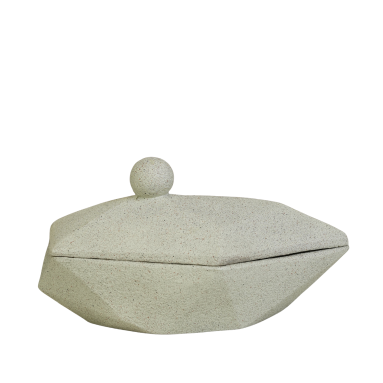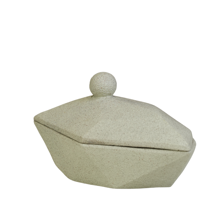 تحفة تقديم عصرية تتميز بتصميم هندسي "سداسي" مبتكر وزوايا فنية تضفي لمسة من الفن المعماري على طاولتك. تأتي المضيفة بلون كريمي هادئ وملمس طبيعي، مزودة بغطاء محكم يعلوه مقبض كروي أنيق لسهولة الرفع والتقديم. مثالية لتقديم الشوكولاتة، التمور، أو الحلويات الصغيرة بأسلوب فاخر وعصري، وتعد إضافة رائعة لمجموعات الضيافة الراقية.