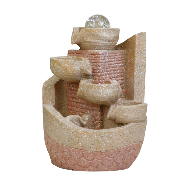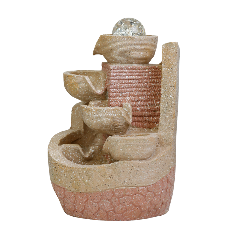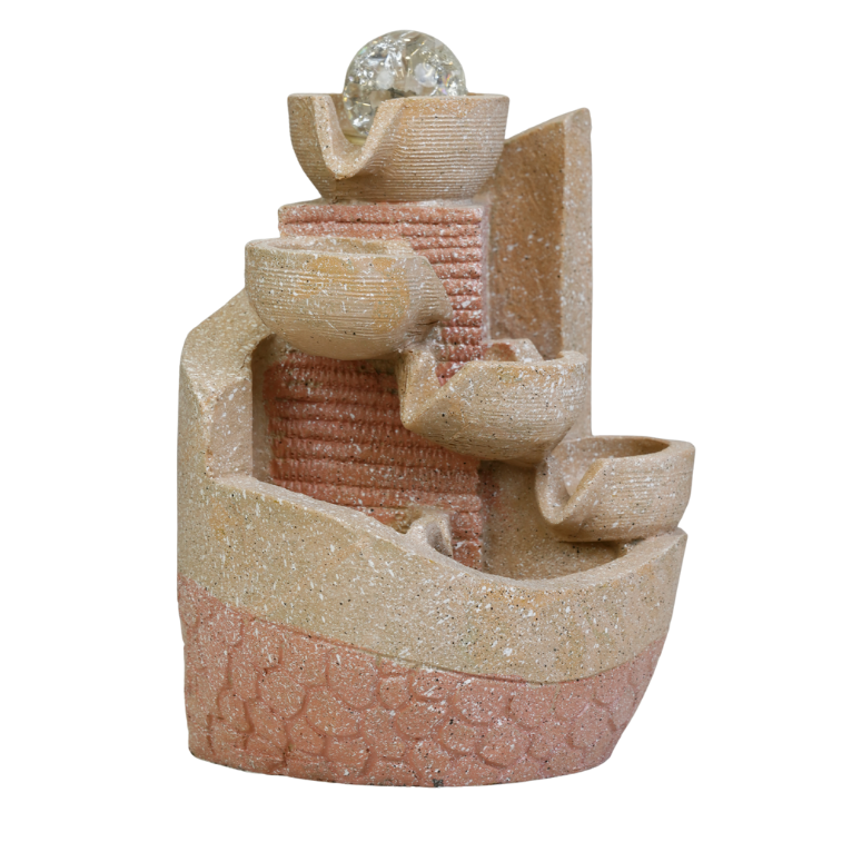 أضف لمسة من الهدوء والأناقة إلى منزلك مع هذه النافورة العصرية المصنوعة من البوليريسين المتين بتصميم يحاكي الحجر الطبيعي. تتميز النافورة بتدفق المياه الانسيابي عبر أربعة مستويات من الجرار، مما يخلق صوتاً مهدئاً يساعد على الاسترخاء. مزودة بكرة كريستالية وإضاءة LED دافئة تضفي مظهراً جمالياً ساحراً، خاصة في المساء. مثالية لتزيين المكاتب، غرف المعيشة، أو زوايا المنزل المختلفة.