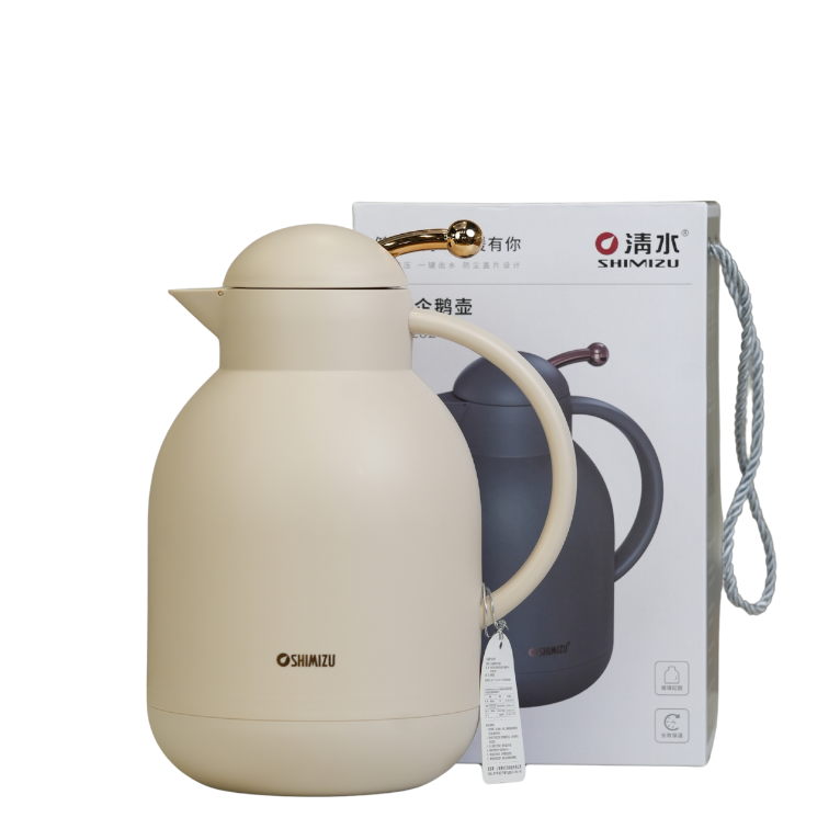 يعتبر ترمس شيميزو مزيجاً رائعاً بين التصميم العصري والأداء العالي. يتميز بجسم خارجي متين بلون "البيج الفاتح" أو "الأسود المطفأ" مع مقبض مريح وسهل الاستخدام. يحتوي على زجاج داخلي عالي الجودة لضمان أقصى درجات العزل الحراري، مما يحافظ على القهوة أو الشاي ساخناً لساعات طويلة. الغطاء محكم الإغلاق لمنع التسرب، ومزود بزر ضغط علوي مطلي باللون الذهبي يضيف لمسة من الفخامة ويسهل عملية التقديم