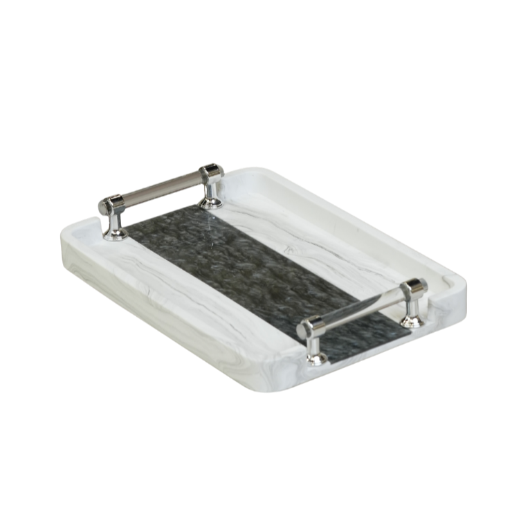 قطعة ديكور فاخرة مصنوعة من الرخام الطبيعي بتصميم "عرق الخشب" العتيق، تتميز بمزيج لوني يجمع بين الأناقة الكلاسيكية واللمسة العصرية. الصينية مزودة بمقابض جانبية تمنحها طابعاً جمالياً وتسهل استخدامها كقطعة للتقديم أو كمنصة لعرض العطور والمجوهرات في غرف النوم والاستقبال